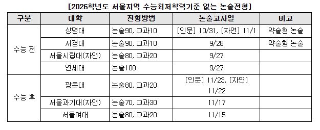 대체로 수능 성적을 필요로 하지 않는 종합전형과 달리, 교과전형과 논술전형에서는 수능최저학력기준을 적용하는 대학이 많아 수험생에 따라서는 부담이 되기도 한다. 수능이 부담스러운 수험생을 위해, 서울권 대학들 중 교과 및 논술전형에서 수능을 요구하지 않는 곳을 진학사가 정리했다.