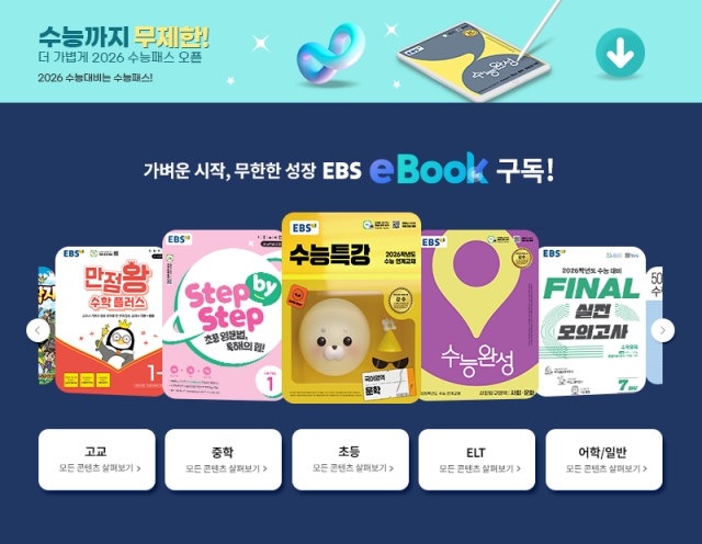 EBS가 ‘EBS eBook 구독 서비스’를 시작했다. 수능 연계교재는 물론 만점왕, 뉴런, 올림포스 등 학교에서의 이용률이 높은 EBS 종이책 학습서를 eBook 구독 서비스를 통해 무제한으로 이용할 수 있다.
