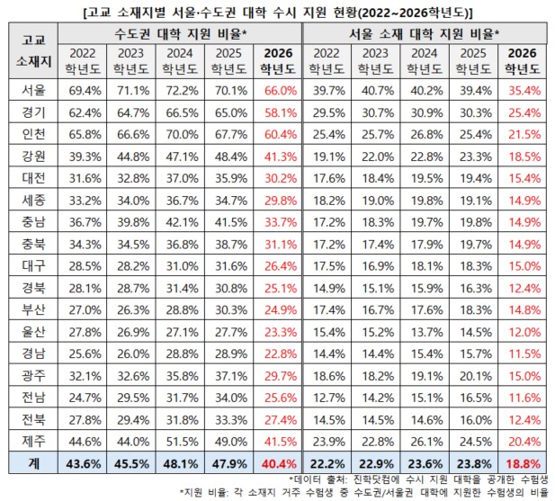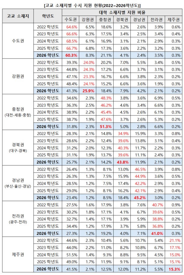 진학사가 15일, 2026학년도 수시 지원 대학을 공개한 수험생(총 268,821건)의 고교 소재지별 지원 현황을 분석한 결과를 공개했다. 분석 결과 수도권 대학 지원 비율이 전국 모든 지역에서 하락한 것으로 확인됐다.