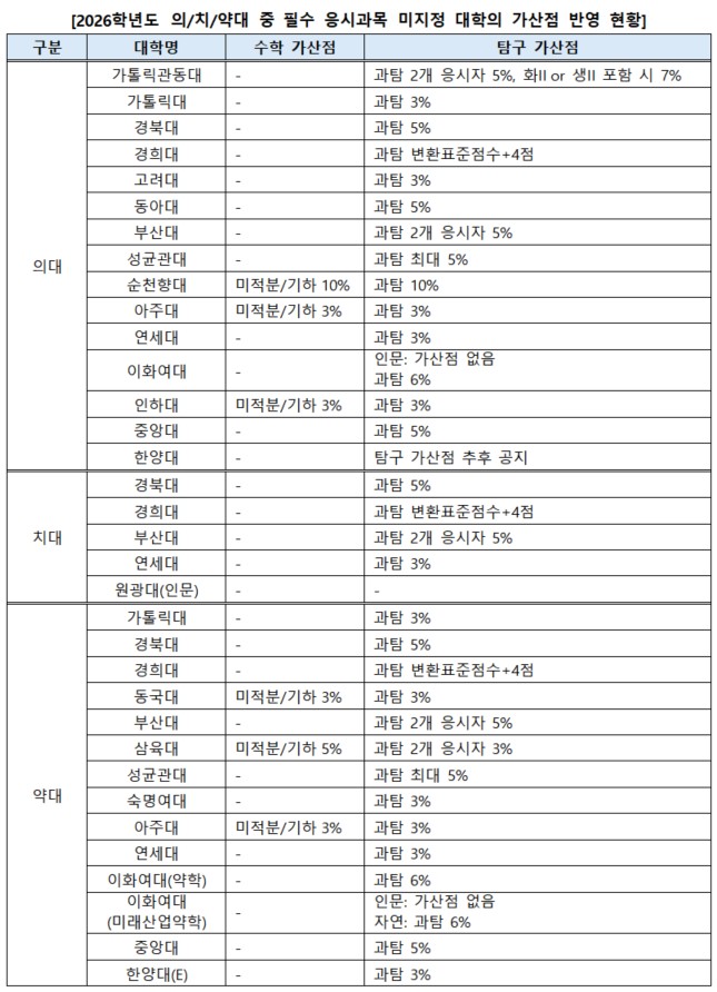 - 의대·치대·약대 사탐 허용 확대됐지만 미적분·과탐 가산점 여전