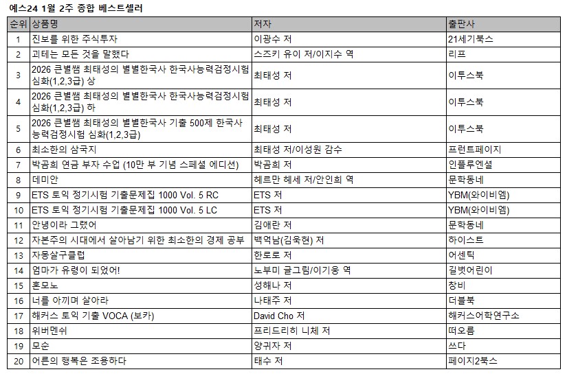 예스24 1월 2주 종합 베스트셀러에서는 광수네 복덕방 대표이자 경제 분야 전문가 이광수 교수의 ‘진보를 위한 주식투자’가 2주 연속 1위에 올랐다. 2025년 아쿠타가와상 수상작 ‘괴테는 모든 것을 말했다’는 지난주보다 한 계단 상승한 2위를 차지했고, ‘2026 큰별쌤 최태성의 별별한국사 한국사능력검정시험 심화(1,2,3급)’ 상, 하편이 나란히 3위와 4위에 올랐다.