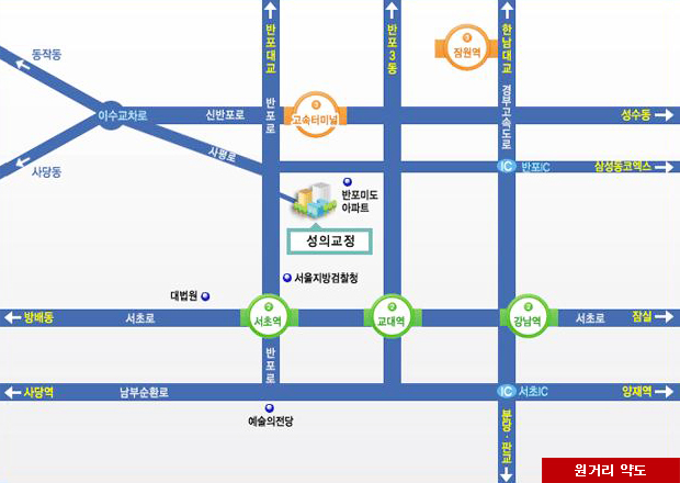 서초역 사거리에서 <37번> 반포로 방향으로 우회전하여 직진하면 가톨릭대학교 성의교정(1km)