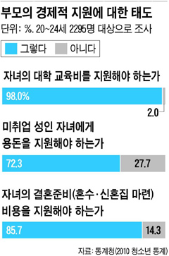 통계청이 발표한 '2010 청소년 통계' 가운데 '부모의 경제적 지원'에 대한 항목을 보면 이런 사실이 확연히 드러난다. 20대 초반 응답자의 절대다수인 98.0%가 '자녀의 대학교육비를 부모가 지원해야 한다'고 답했다. 고민을 해결하는 방법에 대해서는 '스스로 해결한다'는 응답 비율이 2002년 17.0%에서 2008년 13.8%로 뚝 떨어진 반면, '부모에게 의존한다'는 응답은 같은 기간 동안 9.1%에서 17.3%로 두 배 가까이 늘었다.