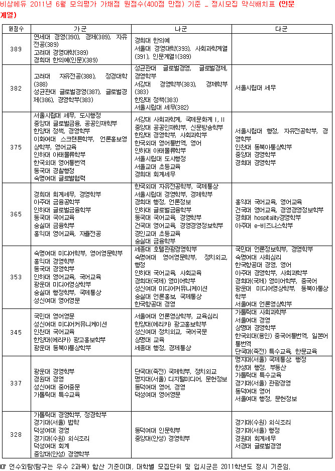 6월 모의평가 가채점 원점수(언수외탐 400점 만점, 탐구 우수 2과목합산 기준) 총점으로 살펴보면, 정시모집에서 인문계열 지원 가능 점수는 서울대 경영대학 393점 / 사회과학계열 391점 / 인문계열1 389점, 연세대 경영 390점 / 경제 389점 / 자유전공 389점, 고려대 경영대학 389점 / 자유전공 388점 / 정경대학 388점, 성균관대 글로벌경영 387점 / 글로벌경제 386점 / 경영학부383점, 서강대 경영학부 383점 / 경제학부 382점 등이다.