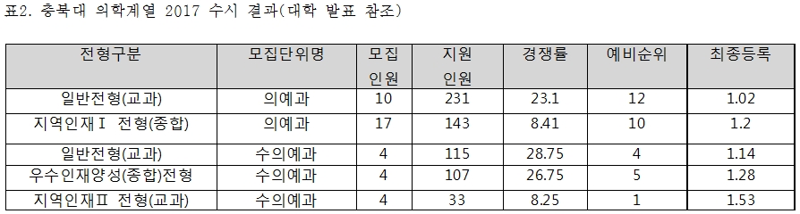 2018학년도 의대 입시에서 충북대는 학생부종합전형인 지역인재전형으로 16명을 선발한다. 지원 자격은 충북. 세종. 대전. 충남 등에서 고교 전 과정을 이수할 것을 요건으로 한다. 작년대비 1명이 줄어든 셈인데, 충북대 의대를 준비하는 수험생들이 특히 아쉬워 할 소식은 학생부교과일반전형 정원이 올해부터 10명에서 2명으로 줄어들어, 실질적으로 서울권에 있는 학생들이 충북대 의대를 수시로 들어가기란 ‘낙타가 바늘구멍 통과하기’ 보다 어렵다고 해도 과언이 아니게 되었다. 인원감축과 함께, 교과전형은 사범대학을 제외하고는 단계별 전형에서 교과 100% 일괄전형으로 바뀌었다. 종합해보건대, 2018학년도 충북대 의대 수시는 거의 충청지역 학생들만의 리그전이라고 볼 수 있겠다.