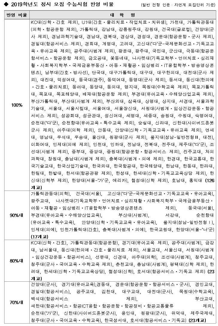 위와 같이 일부 캠퍼스나 모집 군, 모집단위별로 수능시험 반영 비율을 달리하는 경우를 각각으로 보면, 100% 반영이 가톨릭대․서울대․중앙대 등 126개 대학으로 가장 많다. 그 뒤로 60%대 반영이 성결대ㆍ전주교대ㆍ한국국제대 등 26개 대학, 80%대 반영이 남서울대ㆍ서울교대ㆍ충남대(사범계) 등 23개 대학, 70%대 반영이 경인교대ㆍ용인대ㆍ제주국제대 등 23개 대학, 90%대 반영이 건국대(서울)ㆍ서강대ㆍ인제대(의예과) 등 17개 대학, 50%대 반영은 서울한영대ㆍ제주대(‘나’군)ㆍ청운대 등 11개 대학, 30%대 반영이 배재대(항공운항학과)ㆍ한일장신대ㆍ호남신대 등 3개 대학, 40%대 반영이 경주대ㆍ서울기독대 등 2개 대학 순으로 집계되고 있다.
