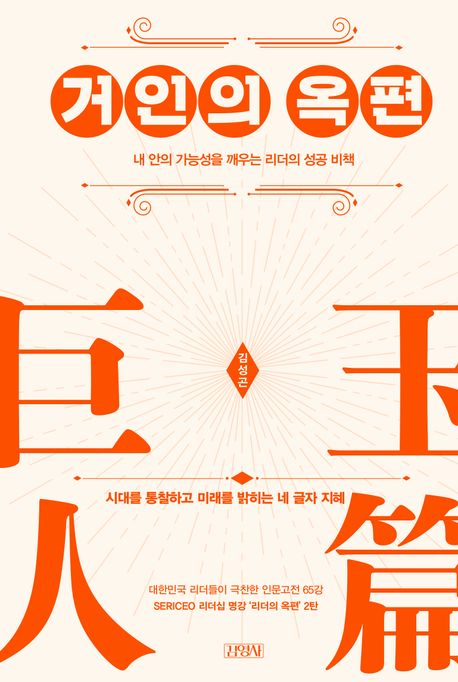 이 책은 ‘리더의 옥편’ 명강의를 새로이 정제하고 다듬어 65강으로 명쾌하게 풀어냈다. 2500년 문사철 속 리더십의 지혜를 시대에 맞게 재해석하고, 이를 고사성어에 빗대어 알기 쉽게 정리했다. 언제 어디서나 빛나는 거인의 품격부터 무엇에도 흔들리지 않는 내공, 사람의 마음을 얻는 리더십, 역경을 뚫고 다시 일어서는 힘까지 놓치지 말아야 한다. 특히 거인의 통찰을 배우고 싶은 내 안의 잠든 거인으로 깨우고 싶은 새로운 시대에 거인이 되고 싶은 리더를 위한 필독서다.