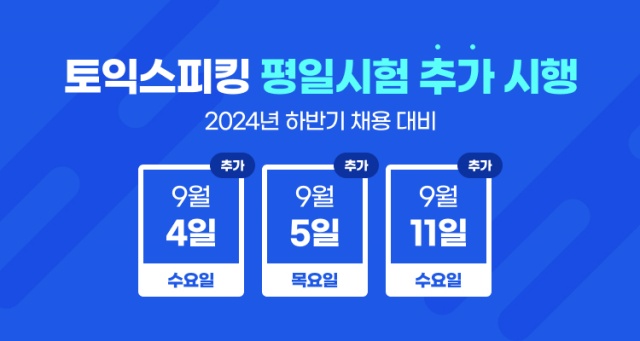 한국TOEIC위원회 관계자는 “삼성그룹 등 다양한 기업의 공채가 진행되는 하반기 채용에 맞춰 취업준비생들의 입사 지원을 돕고자 토익스피킹 시험을 추가 시행한다”며 “미리 요건에 맞는 어학성적을 취득해 놓으면, 보다 효율적으로 취업을 준비할 수 있을 것”이라고 말했다.