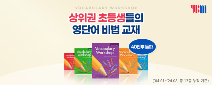 YBM이 국내 독점 공급중인 영어 어휘 학습서 ‘Vocabulary Workshop’이 주요 온라인서점의 외국도서 유아·어린이 부문과 어린이 ELT 부문에서 베스트셀러 1위(Green 레벨 - 예스24, Purple 레벨 - 교보문고 / ‘24년 9월 30일 주간 발표기준)를 차지했다.