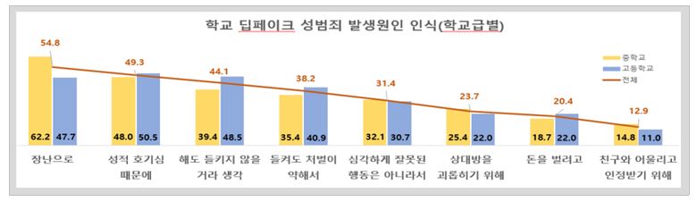 학교에서 딥페이크 성범죄가 발생하는 원인으로는 54.8%의 응답자가 ‘장난으로’를 1순위로 꼽았다. ‘성적 호기심 때문에’ 49.3%, ‘해도 들키지 않을 것이라고 생각해서’ 44.1%, ‘들켜도 처벌이 약해서’ 38.2%, ‘심각하게 잘못된 행동은 아니라고 생각해서’ 31.4%의 응답을 보였다.