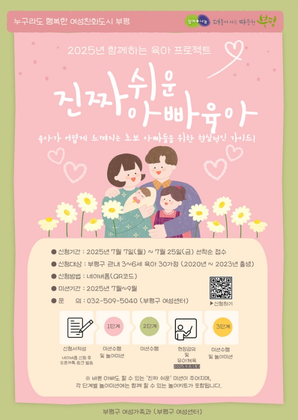 인천 부평구에 거주하는 총 30가정을 모집하며, 오는 25일까지 선착순 접수된다. 참여 희망 가정은 네이버 폼과 포스터 내 큐알코드를 통해 참여 신청하면 된다.