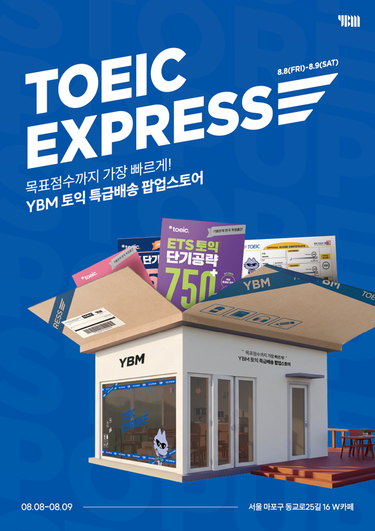 국내 토익 주관사 YBM이 8일부터 9일까지 양일간 서울 마포구 홍대입구역 인근 W카페에서 ‘TOEIC EXPRESS’ 팝업스토어를 운영한다.
