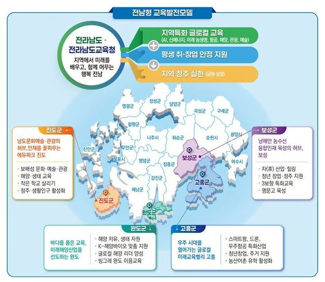 사업 주제는 ▲고훙- 우주 시대를 열어가는 글로컬 미래교육밸리 ▲보성- 남해안 농수산 융합인재 육성의 허브 ▲완도- 바다를 품은 교육, 미래 해양산업 선도 ▲진도- 남도 문화예술·관광의 허브 등이다