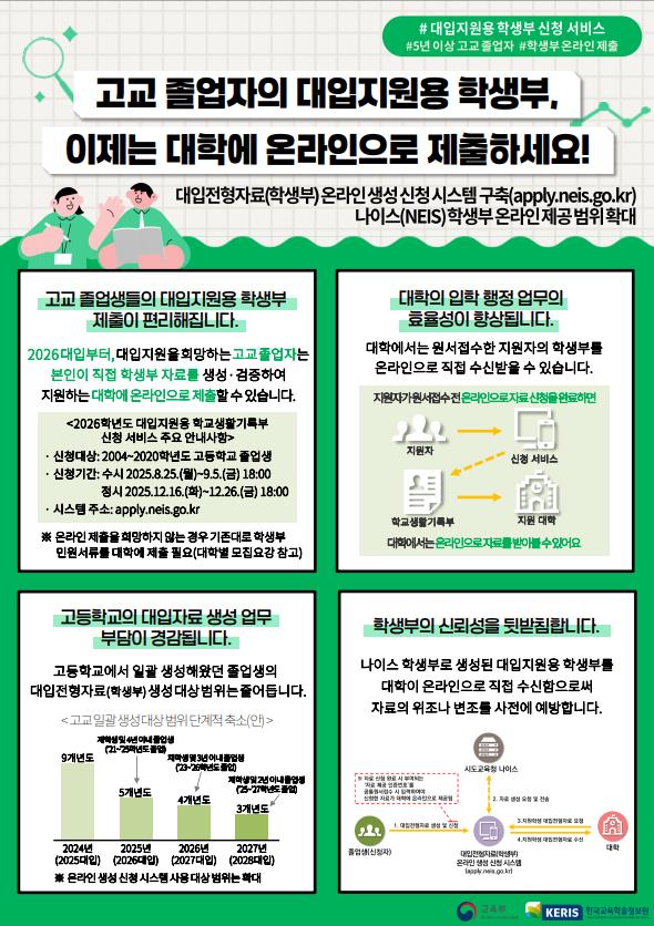 교육부와 한국교육학술정보원이 고교 졸업자 대상 ‘대입지원용 학교생활기록부 신청 서비스’를 위한 시스템을 구축했다.
