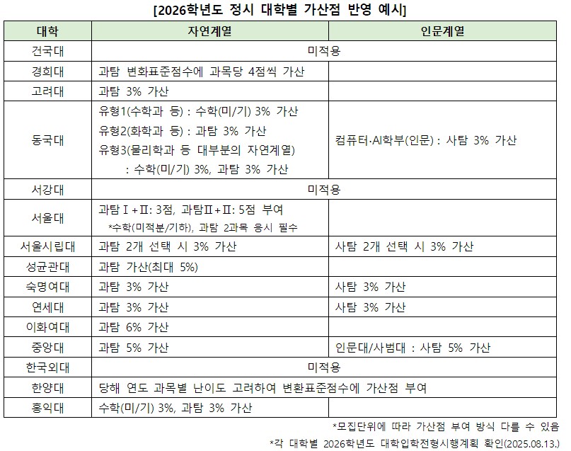 또, 인문계열 모집단위에 지원 시 사회탐구에 가산점을 주는 대학도 있다. 서울시립대는 사회탐구를 2과목 선택할 때 3%의 가산점을 부여하고, 중앙대는 인문대학과 사범대학 지원 시 사회탐구에 5%의 가산점을 부여하기도 한다. 이와 같이 가산점 규모에 따라 합격 가능성이 달라질 수 있다는 점도 꼭 미리 알고 있어야 하는 사항이다.