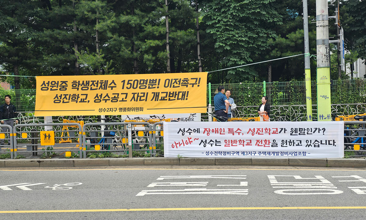 그러나 성수동 일부 주민들이 특수학교가 아닌 일반 학교 설립을 요구하며 반발하자, 설립은 뜻밖의 난항에 처했다. 지난해 총선 당시 윤희숙 국민의힘 후보는 성동구 교육의 질을 높이겠다며 성진학교 부지에 특목고를 유치하겠다는 공약을 내걸었던 바 있다. 이에 더해 황철규 서울시의원은 지난 6월 진행된 주민 설명회에서 “성진학교는 덕수공고로 부지를 옮기고, 성수공고는 우리 지역 주민들이 원하는 좋은 고등학교를 유치해 달라고 교육청에 요구 중”이라고 밝히기도 했다.