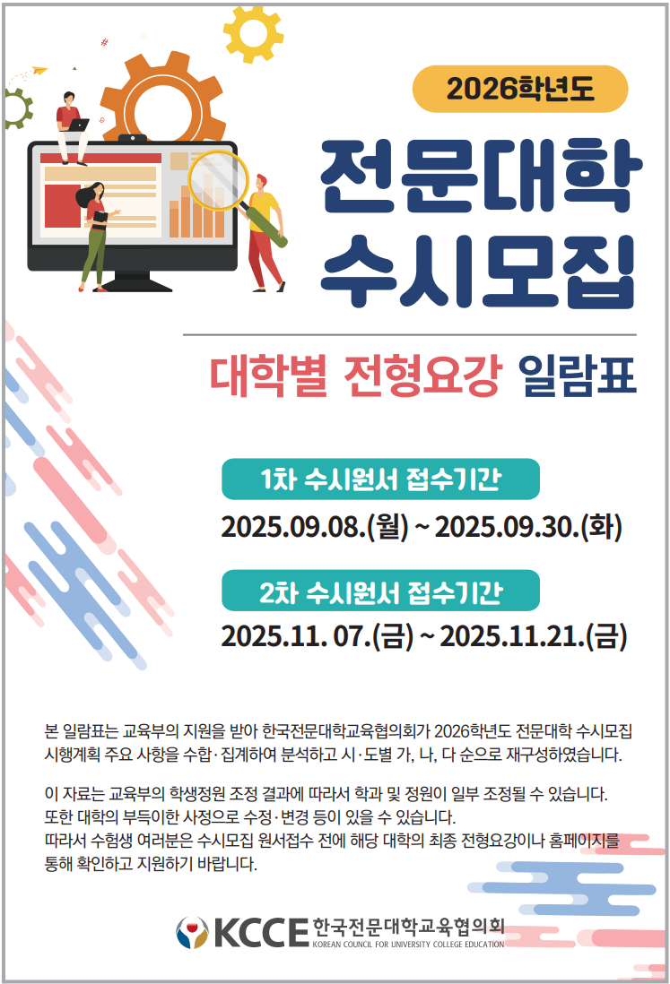 한편, 전국 125개 전문대학의 전형 요강을 한눈에 볼 수 있도록 ‘2026학년도 전문대학 수시모집 대학별 전형요강 일람표’도 무상으로 배포하고 있어 다운로드 후 바로 사용할 수 있다.