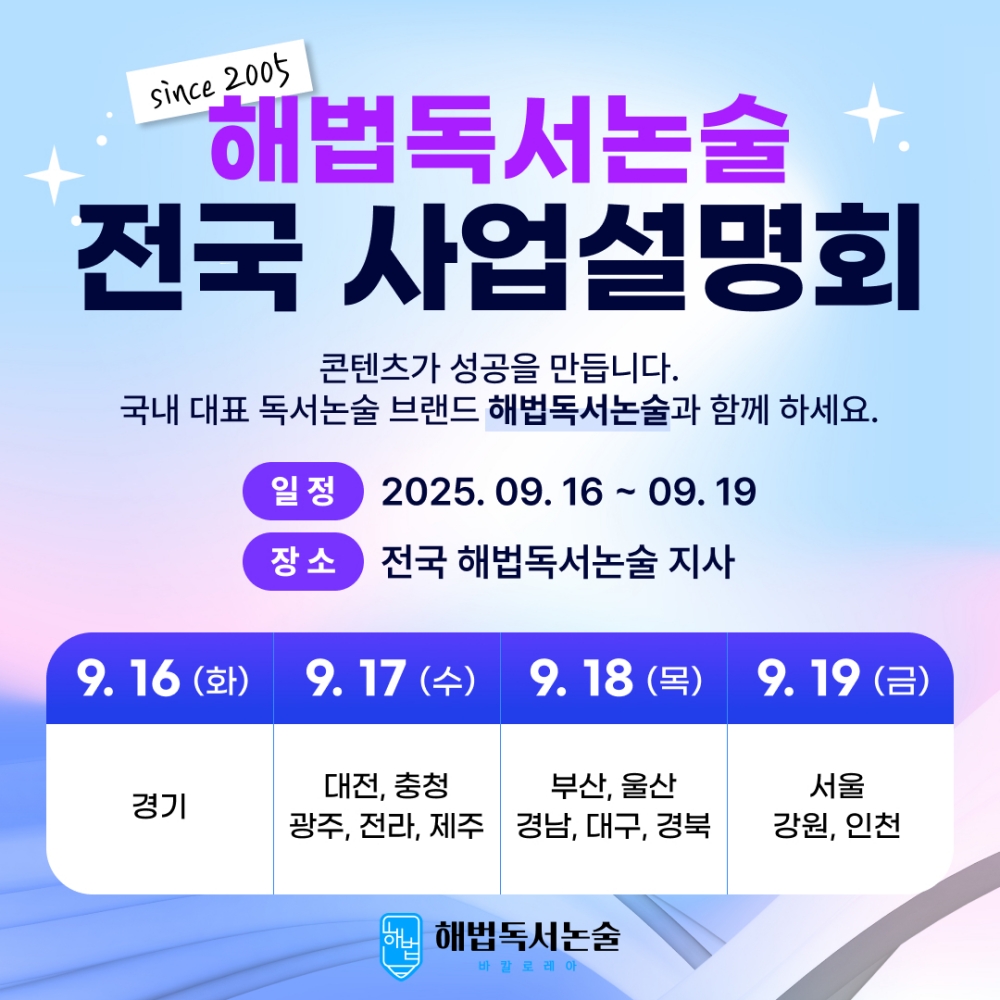 사업설명회는 전국 해법독서논술 지사에서 동시 진행되며, 참가 신청은 해법독서논술 공식 홈페이지를 통해 가능하다.
