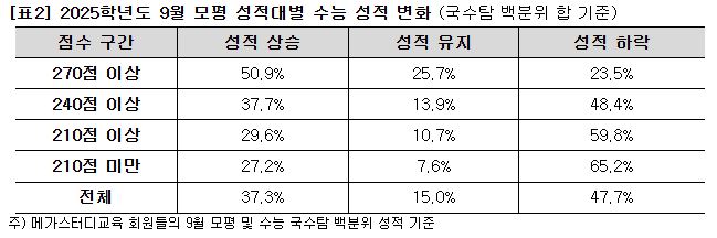 2025학년도 9월 모평보다 실제 수능에서 성적이 상승한 학생은 37.3%, 유지는 15.0%, 하락은 47.7%로 분석됐다.