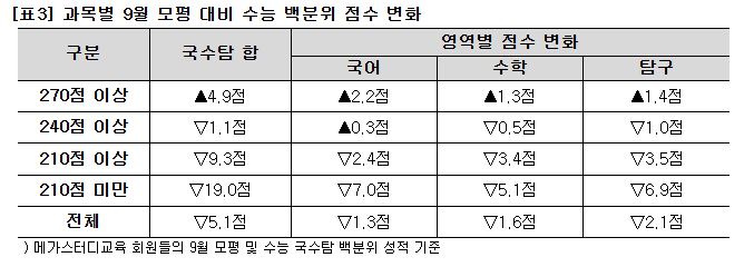 실제 점수 변화를 보면, 전체적으로 국수탐 백분위 합 기준 5.1점 하락했으며, 영역별로는 탐구 2.1점, 수학 1.6점, 국어 1.3점 순으로 하락했다. 상위권인 국수탐 백분위 합 270점 이상에서는 오히려 4.9점 상승했는데 국어 2.2점, 수학 1.3점, 탐구는 1.4점 상승했다.