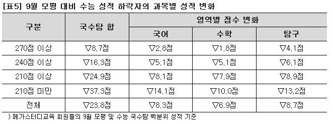 성적이 하락한 경우에는 국수탐 백분위 합 기준 23.8점 떨어졌다. 영역별로는 탐구 8.7점, 국어 8.3점, 수학 6.9점 순으로 하락했다. 특히, 210점 미만인 하위권 학생들이 37.3점 하락으로 가장 많이 떨어졌다.