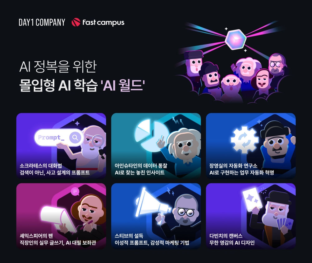 데이원컴퍼니의 실무 교육 브랜드 ‘패스트캠퍼스’가 몰입형 AI 학습 콘텐츠 ‘AI 월드’를 론칭하고 전 연령 대상의 AI 교육 콘텐츠를 확대한다.