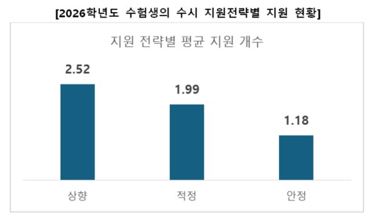 수험생들은 대입 수시 지원에서 안정적인 지원보다는 다소 도전적인 지원 전략을 선호하는 것으로 나타났다. 6장의 수시 카드 중 1인당 상향 지원 개수가 평균 2.52개로 가장 많았으며, 안정 지원은 1.18개에 그쳤다. 이는 “수시에서는 한 단계 더 높은 대학에 도전한다”는 수험생들의 심리가 반영된 결과라고 할 수 있다.