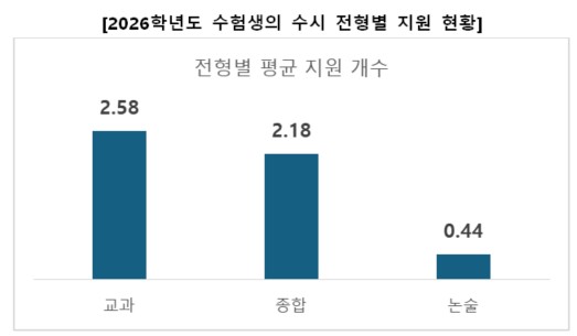 전형별 지원 현황을 보면, 1인당 평균 지원 수는 학생부교과전형이 2.58개, 학생부종합전형 2.18개, 논술전형 0.44개로 나타났다. 이는 내신 성적을 기반으로 하는 교과전형이 가장 보편적이고 안정적인 선택지로 여겨지고 있음을 보여준다. 반면, 논술전형은 소수의 학생들만이 선택하는 전략적인 카드로 활용됐다.