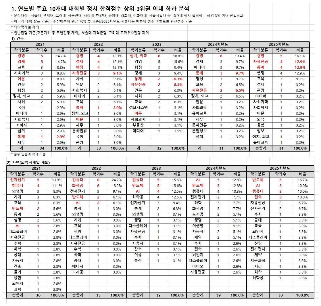 2025학년도 정시모집에서 서울대·연세대·고려대(서연고)를 포함한 주요 10개 대학의 합격점수 상위권 학과를 분석한 결과, 인문계에서는 ‘경영학과’, 자연계에서는 ‘반도체 관련 학과’가 가장 많은 비중을 차지한 것으로 나타났다.