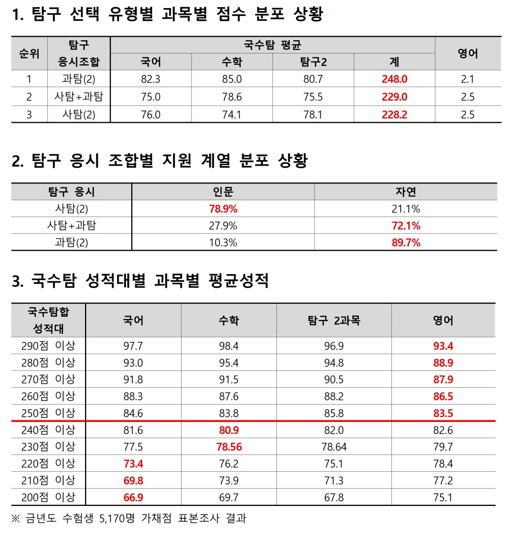 국어·수학·탐구(2과목) 원점수 합산(300점 기준)은 ▲과탐 2과목 선택 집단 248.0점 ▲사탐1·과탐1 선택 집단 229.0점 ▲사탐 2과목 선택 집단 228.2점으로 집계됐다.