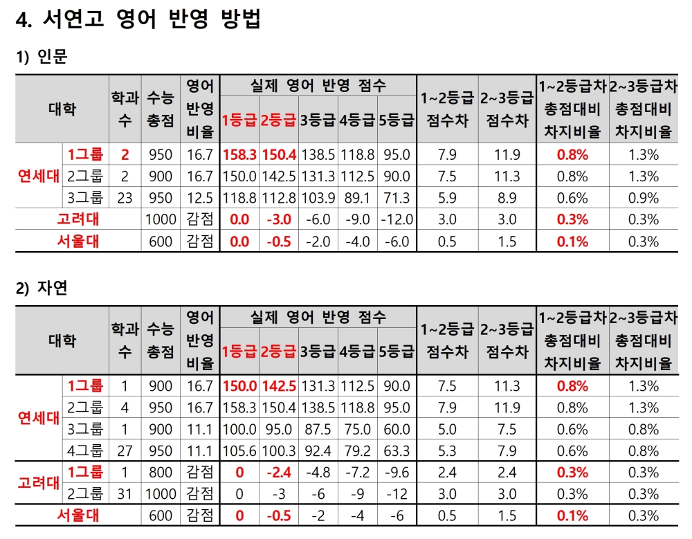 상위권에서 영어가 가장 낮게 형성된 만큼, 대학별 영어 반영 방식이 정시 지원의 중요한 변수로 떠오르고 있다. 현재 서울대·연세대·고려대 중에서는 서울대의 영어 반영 비중이 가장 낮은 것으로 분석되며, 다음으로 고려대, 연세대 순이다.