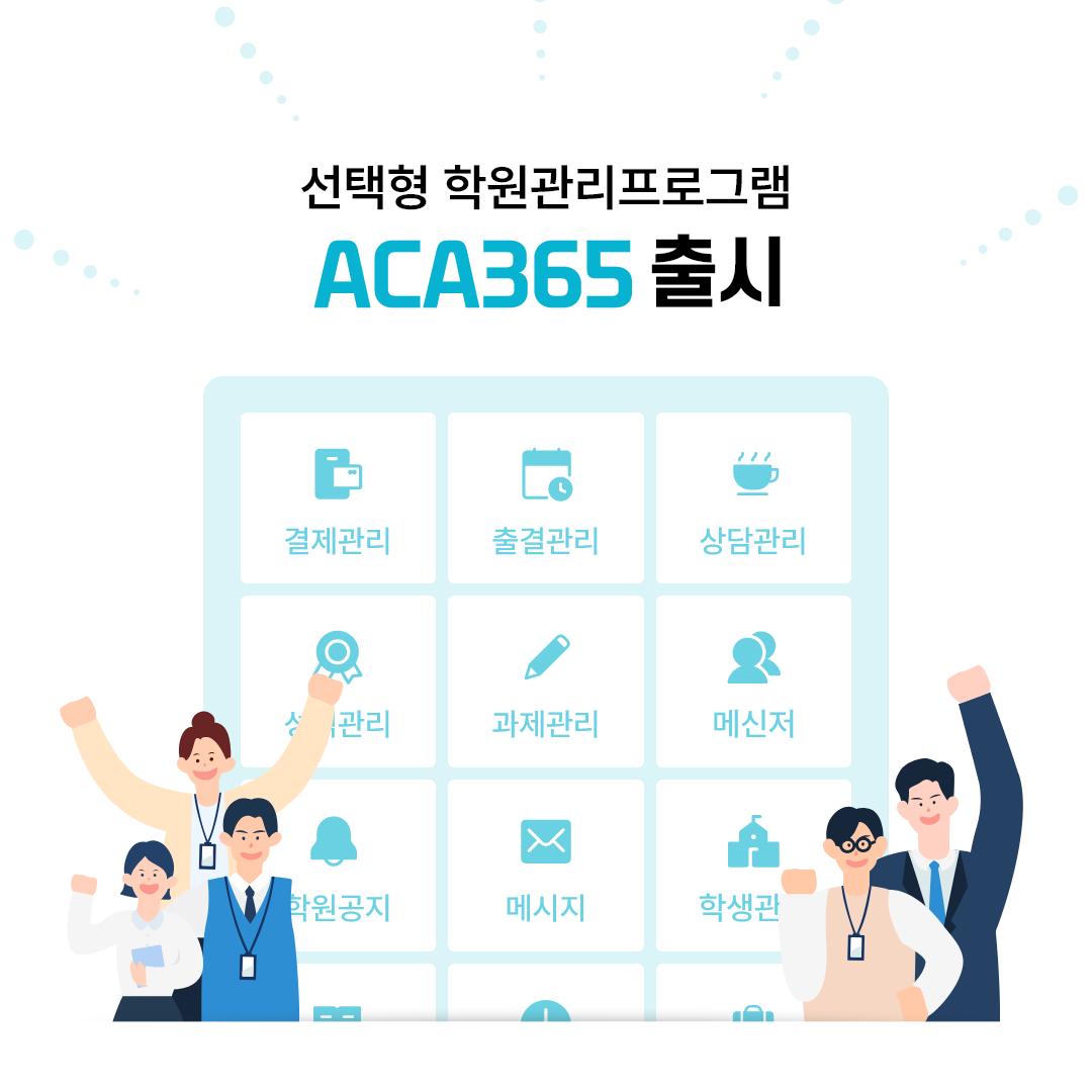 ACA365는 학원 운영의 기본이 되는 학생관리 기능을 중심으로, 결제·출결·성적·상담 등 필요한 기능만 선택해 사용할 수 있도록 설계된 맞춤형 학원관리 서비스이다.