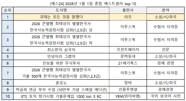 ◇ 2026년 첫날 1위는 ‘괴테는 모든 것을 말했다’… 최근 10년간 세 번째 ‘소설’ 정상 사례