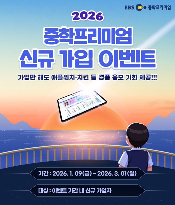 EBS가 겨울방학 기간과 새 학기를 앞두고 중학생들의 학습 준비를 지원하기 위해 ‘EBS 중학프리미엄’(이하 중학프리미엄)에서 신규가입 이벤트를 진행한다고 밝혔다. 이번 이벤트는 예비 중1~중3 학생을 대상으로, 겨울방학 동안 학습 흐름을 이어가고 새 학기 학습 준비를 돕기 위해 마련됐다.