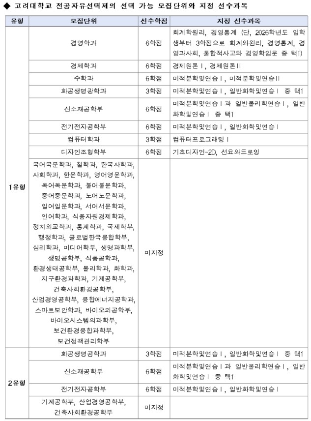 고려대 무전공 입학자들의 유형별 선택 가능한 모집단위와 선수과목은 아래 도표와 같다.