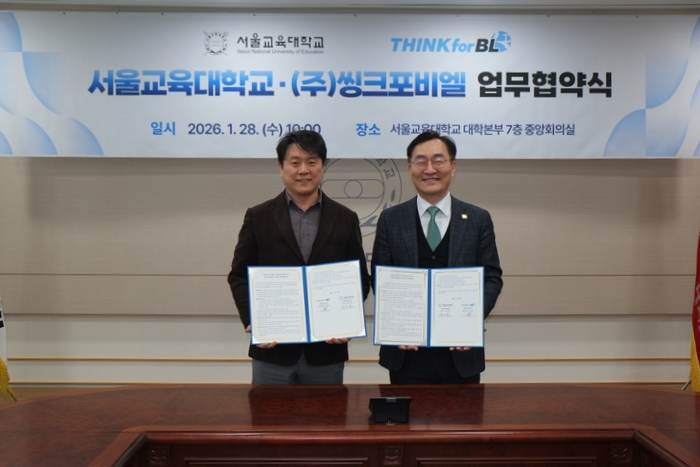 서울교대와 씽크포비엘은 28일 오전 서울교대 대학본부 중앙회의실에서 ‘AI 신뢰성’ 역량 강화 목적의 교육‧인력 양성 및 관련 사업에 관한 상호 교류‧협력 업무협약(MOU)을 체결했다.