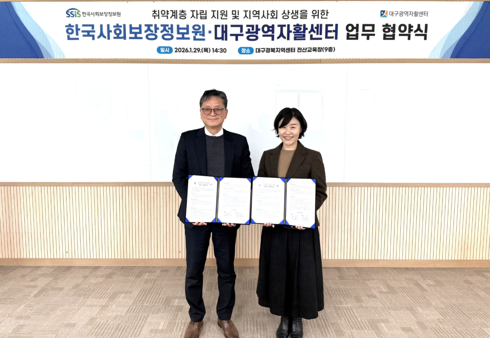 한국사회보장정보원(원장 김현준) 대구경북지역센터는 지난 29일 대구경북지역센터 전산교육장에서 대구광역자활센터(센터장 박송묵)와 지역사회 상생과 자활사업 참여자 지원 강화를 위한 업무협약(MOU)을 체결했다.