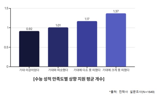 수능 성적에 대한 인식은 실제 정시 지원 전략에도 영향을 미친 것으로 분석된다. 성적이 ‘기대 이상’이었다고 응답한 수험생의 평균 상향 지원 개수는 0.92개였던 반면, ‘기대에 크게 못 미쳤다’고 답한 수험생은 평균 1.37개의 상향 지원 카드를 활용했다.