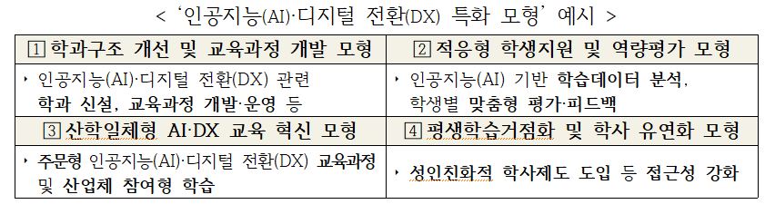 참여 대학들은 지역 산업과 대학별 강점을 결합한 ‘인공지능(AI)·디지털 전환(DX) 특화 모형’을 구축하게 된다. 각 대학은 ▲학과 구조 개선 ▲데이터 기반 학생 지원 ▲산학협력 교육 ▲학사제도 유연화 등 필요한 모형을 자율적으로 선택해 추진할 수 있다.