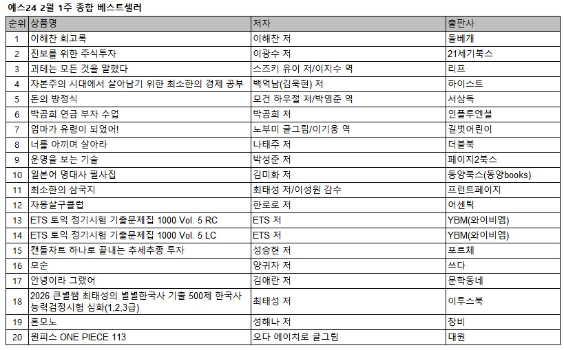 예스24 2월 1주 종합 베스트셀러 순위에서 고(故) 이해찬 전 국무총리의 ‘이해찬 회고록’이 새롭게 1위에 올랐다. 지난 1월 4주 연속 1위를 지켰던 이광수 교수의 ‘진보를 위한 주식투자’는 2위로 한 계단 내려왔으며, 2025년 아쿠타가와상 수상작 ‘괴테는 모든 것을 말했다’는 3위를 유지했다.