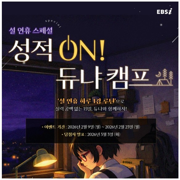 EBS가 설 연휴를 맞아 수험생들의 학습 동기 강화를 위한 특별 이벤트 ‘성적 ON! 듀냐 캠프’를 진행한다고 밝혔다.