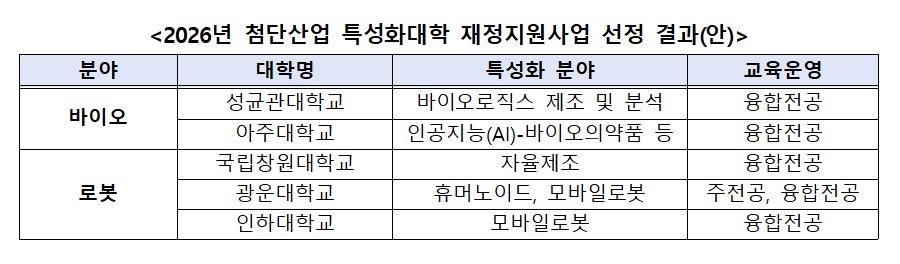 - 산업계 수요 기반 학사 인재 양성을 위한 바이오(2개), 로봇(3개) 특성화대학 선정