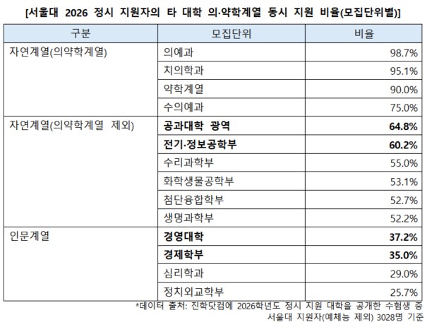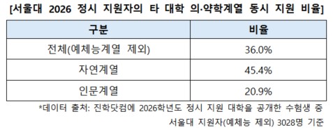 진학사가 2026학년도 정시 지원 대학을 공개한 수험생 가운데 서울대 지원자(예체능 제외, 3028명)의 타 대학 지원 현황을 분석한 결과, 서울대 지원자의 36.0%가 의대·치대·한의대·약대·수의대 등 의·약학계열 모집단위에 동시에 지원한 것으로 나타났다.