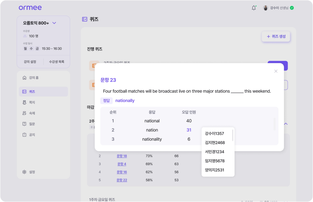 그동안 많은 강사들은 강의력 향상보다 숙제 검사, 공지 전달, 질문 답변 등 여러 채널을 관리하는 데 상당한 시간을 소모해왔다. 오르미는 이러한 현장의 불편을 개선하는 데 초점을 맞췄다. 숙제 확인부터 시험 결과 기록까지 전 과정을 자동화해, 정식 버전 기준 수업 관리 시간을 기존 대비 50% 절감할 수 있도록 설계됐다.