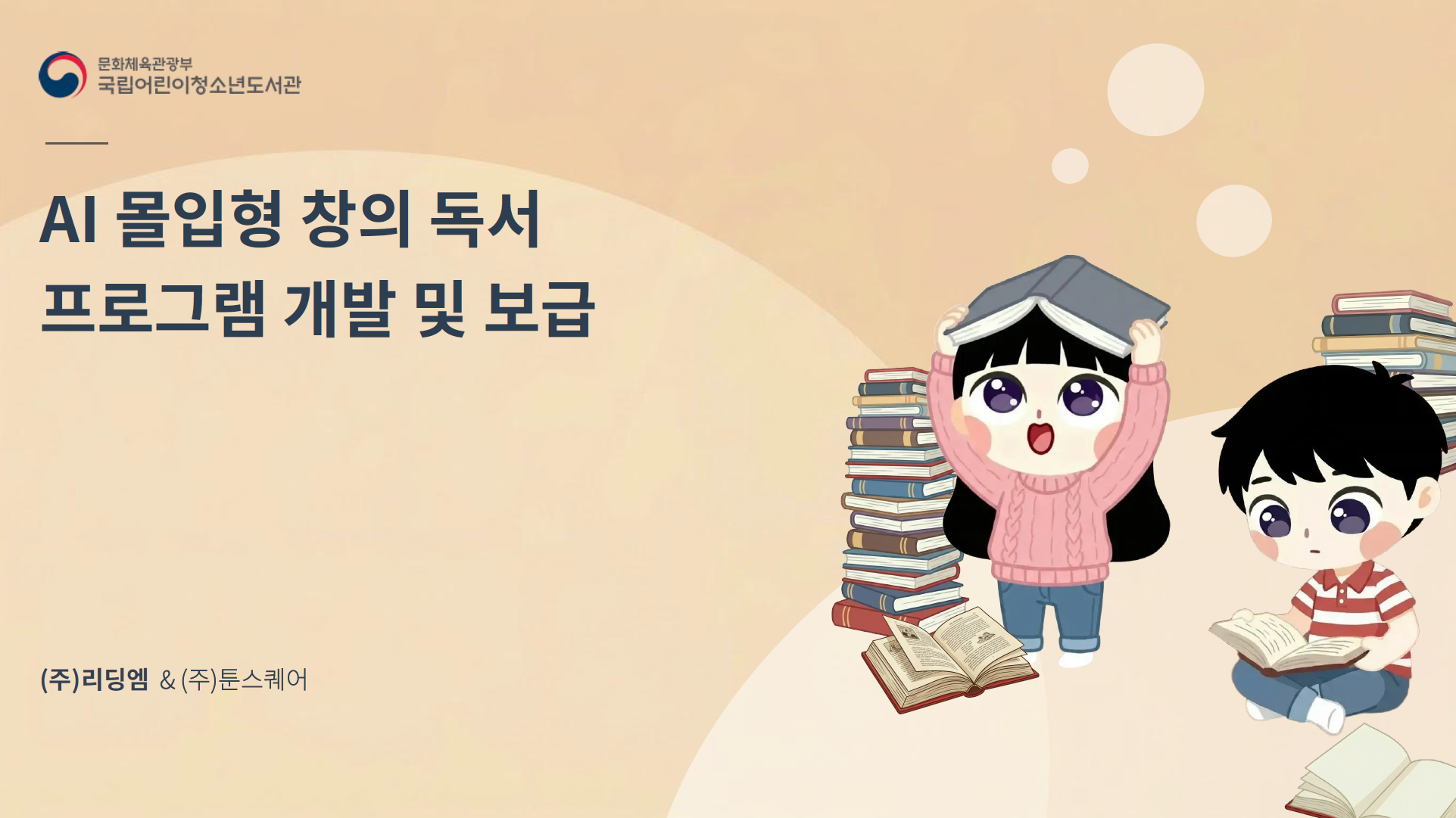 ㈜리딩엠이 툰스스퀘어와 공동으로 국립어린이청소년도서관이 추진하는 ‘AI 몰입형 창의 독서 프로그램 개발 및 보급’ 사업의 수행기관으로 선정됐다.