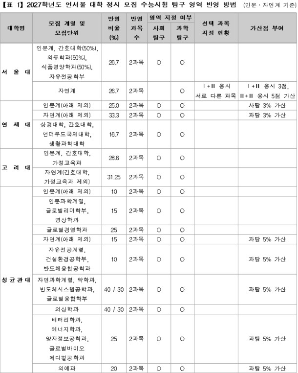 먼저 2027학년도 정시 모집 자연계 모집단위에서 과학탐구 응시를 필수로 지정하는 대학으로는 서울대뿐이다. 특히 서울대는 과학탐구 Ⅰ과목과 Ⅱ과목을 함께 응시하고자 할 경우에는 서로 다른 과목으로 응시토록 하면서 Ⅰ+Ⅱ과목 응시자에게는 3점, Ⅱ+Ⅱ과목 응시자에게는 5점의 가산점을 부여한다.