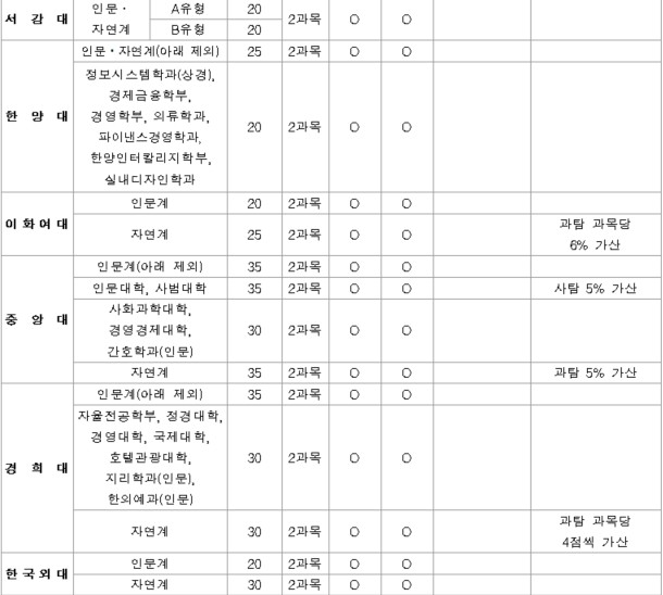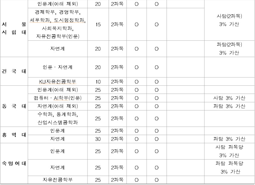 경희대는 자연계 모집단위에서 과학탐구 응시자에게 과목당 4점씩을 가산점으로 부여하고, 동국대는 수학과·통계학과·산업시스템공학과 제외한 자연계 모집단위에서 과학탐구 응시자에게 취득 점수의 3%의 가산점을 부여하고, 컴퓨터·AI학부(인문)에서는 사회탐구 응시자에게 취득 점수의 3%를 가산점으로 부여한다. 홍익대도 자연계 모집단위에서 과학탐구 응시자에게 취득 점수의 3%를 가산점으로 부여한다.