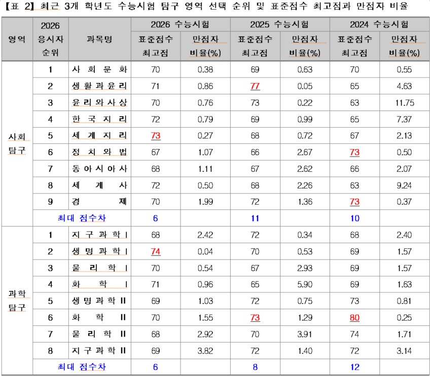 올해로 마지막 시행이 되는 2027학년도 수능시험에서 탐구 영역은 사회탐구 9과목과 과학탐구 8과목에서 최대 2과목을 선택하여 응시하면 된다. 즉, 사회탐구에서 2과목 또는 과학탐구에서 2과목을 선택 응시하거나, 사회탐구에서 1과목과 과학탐구에서 1과목을 선택하여 응시하면 된다. 하지만 고등학교 2학년 학생들이 내년에 치르게 2028학년도 수능시험 탐구 영역은 선택 과목이 폐지되고 수험생들은 통합사회와 통합과학을 모두 응시해야 한다.