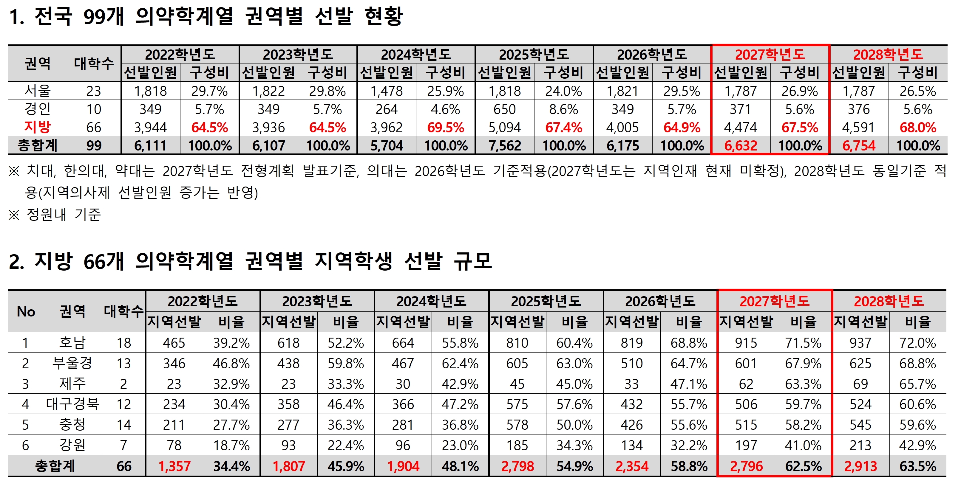 2027학년도 기준 전국 의치한약 99개 대학에서는 총 6632명을 선발하며, 이 가운데 67.5%에 해당하는 4474명이 비수도권에서 선발된다. 비수도권 66개 대학의 4474명 중 62.5%인 2,796명이 지역인재전형 및 지역의사제 등을 통해 지방권 지역학생으로 선발될 예정이다.