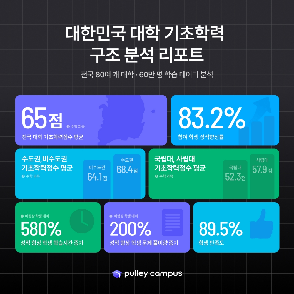대학에서 기초학력 격차는 단순한 성적 차이를 넘어 전공 수업 적응과 학업 지속에도 영향을 미치는 중요한 과제입니다. 풀리캠퍼스는 학생의 수준을 정밀하게 진단하고, 그 결과에 맞춘 보완 학습을 즉시 이어갈 수 있도록 설계돼 있습니다.